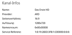 The channel reference is displayed e.g. with an active program on the box via Menu->Information. Only the file suffix (*.png) is then attached to the channel reference, which must have a colour depth of 8 or 32 bit. If these conditions are fulfilled, we now need the following conditions so that the picons are also displayed on the box.